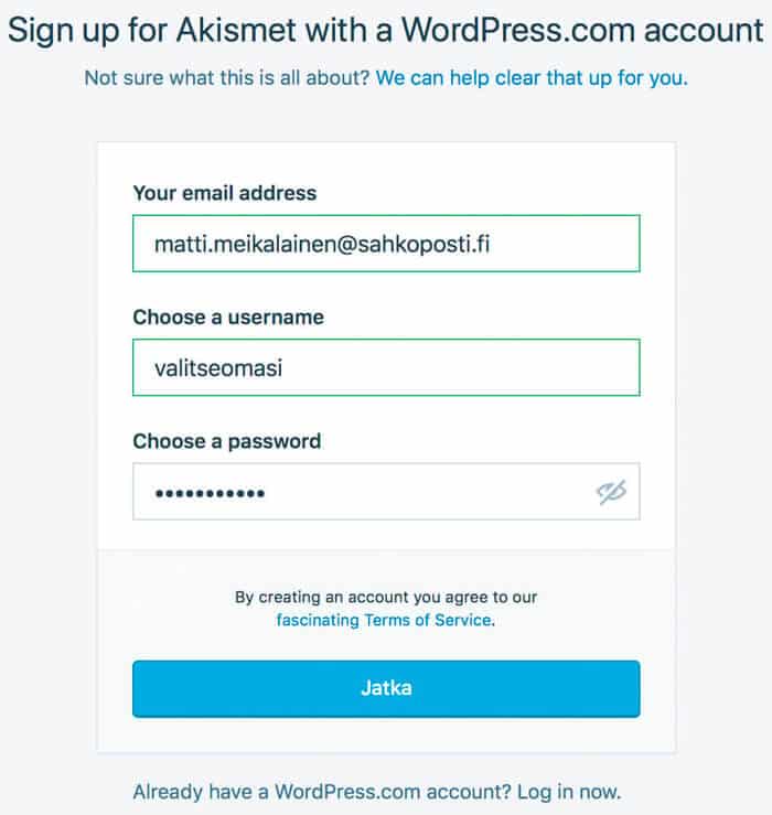 5. Klikkaa sign up for Akismet now ja luo itsellesi WordPress.com-tili tai kirjaudu sisään olemassaolevilla WordPress.com -tunnuksilla.